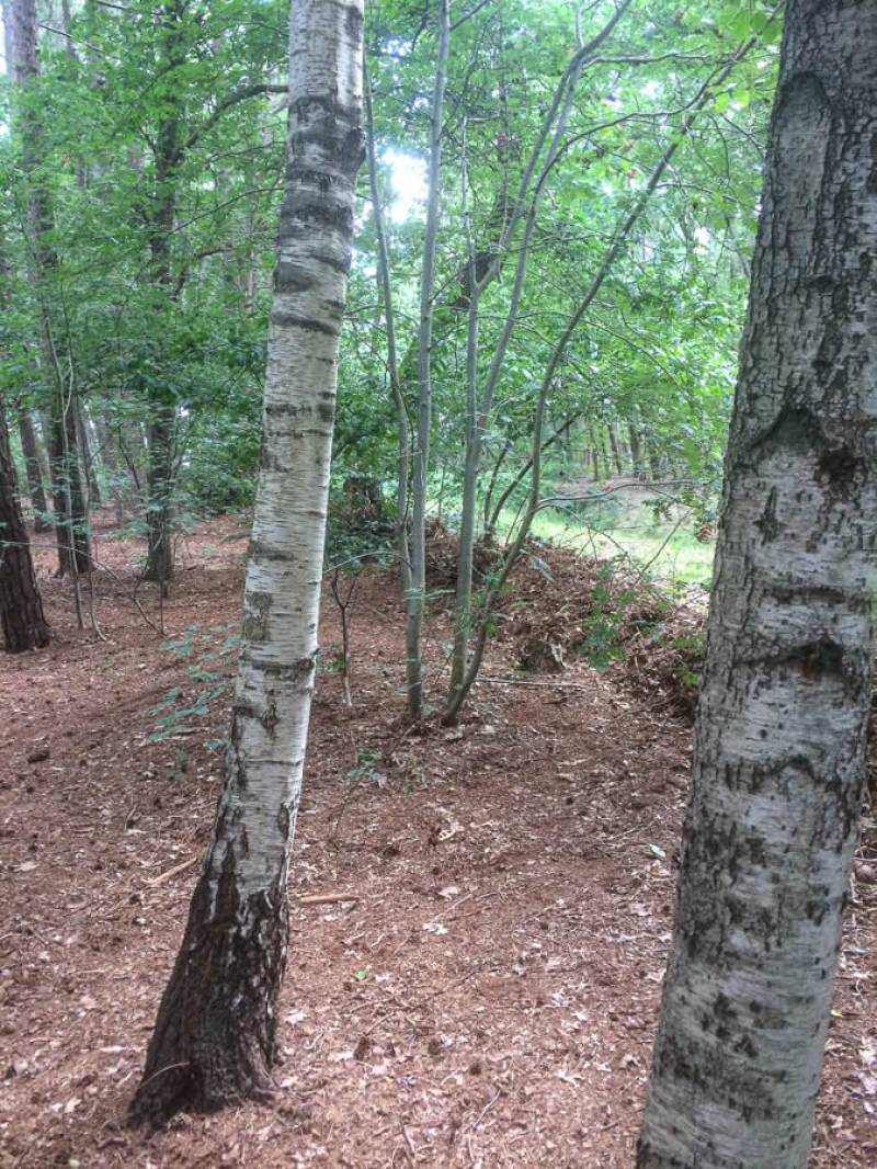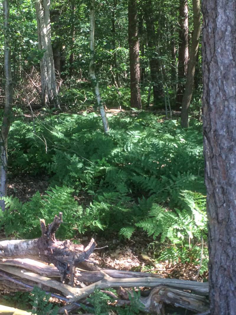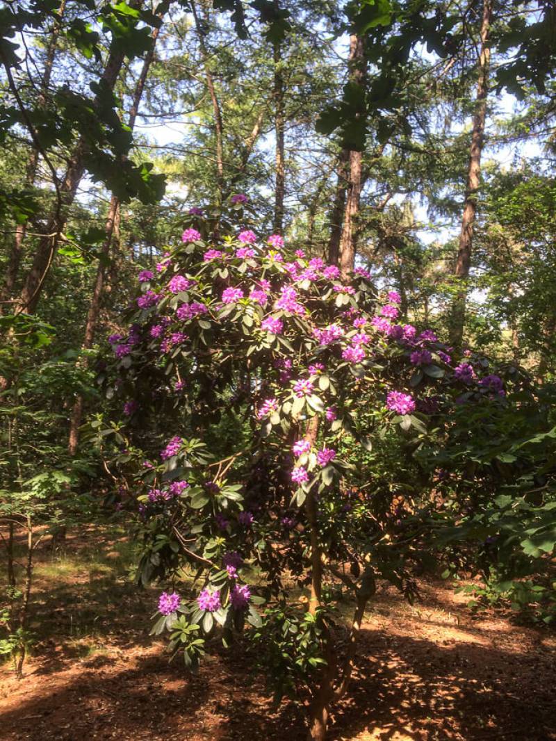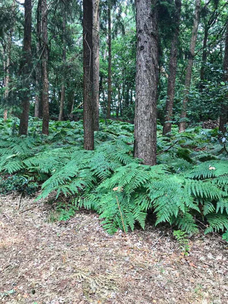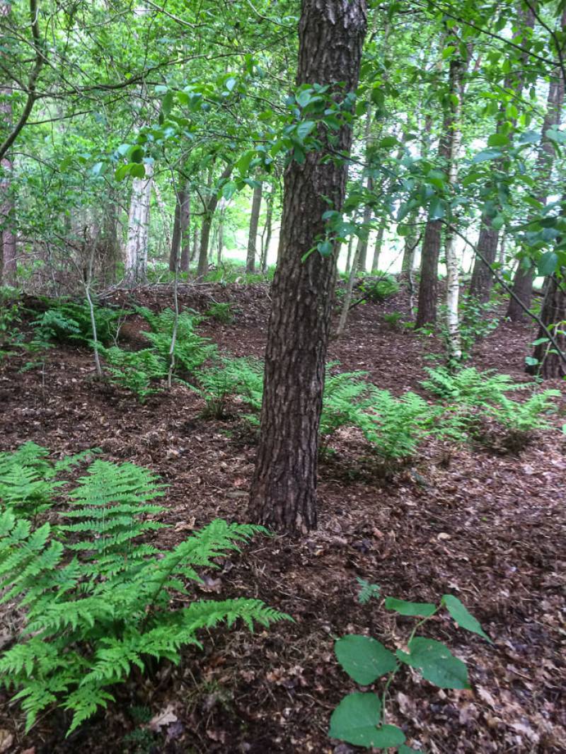 Een parkachtig vogelrijk perceel als dit kom je niet vaak tegen. Het bos is rijk begroeid met een zeer gevarieerde opstand: den, lariks, eik en berk. De ondergroei bestaat uit varens, rododendron, taxus, hulst, laurier en bramenstruiken. De goed getemde duizendknoop maakt het plaatje compleet.
