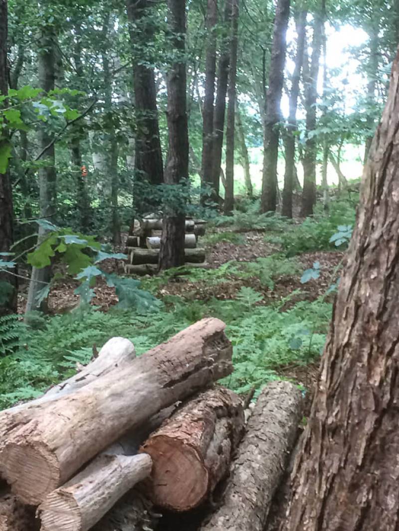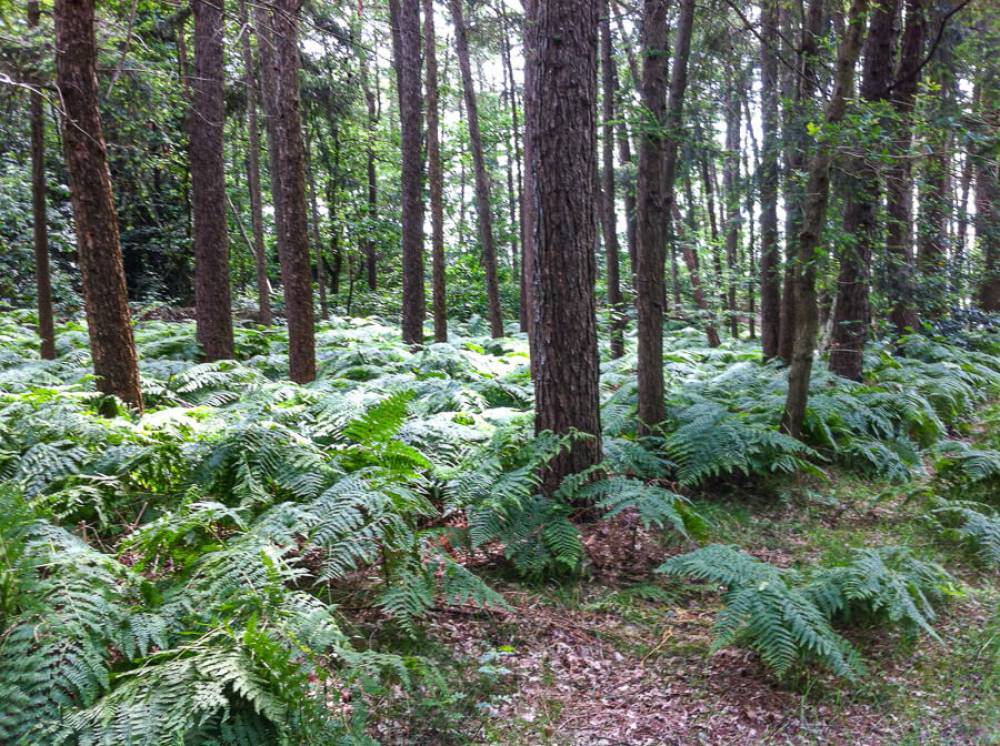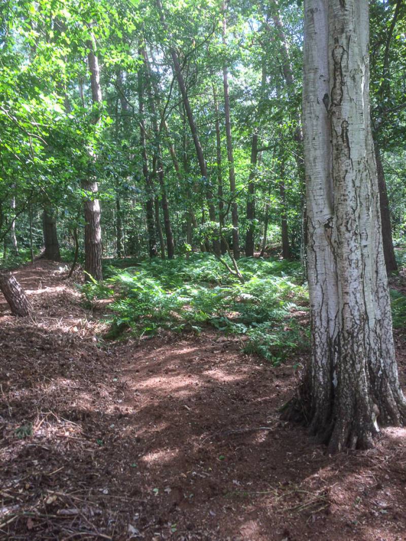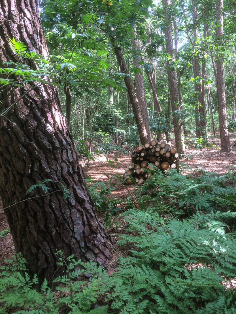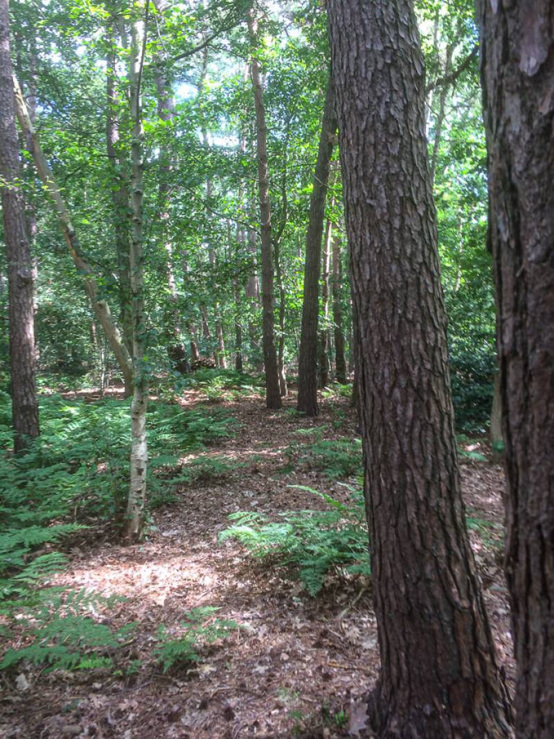 Een parkachtig vogelrijk perceel als dit kom je niet vaak tegen. Het bos is rijk begroeid met een zeer gevarieerde opstand: den, lariks, eik en berk. De ondergroei bestaat uit varens, rododendron, taxus, hulst, laurier en bramenstruiken. De goed getemde duizendknoop maakt het plaatje compleet.
